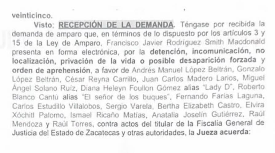 “Recepción de la demanda. Téngase por recibida la demanda de amparo que, en términos de lo dispuesto por los artículos 3 y 15 de la Ley de Amparo, Francisco Javier Rodríguez Smith Macdonald presenta en forma electrónica, por la detención, incomunicación, no localización, privación de la vida o posible desaparición forzada y orden de aprehensión, a favor de Andrés Manel López Beltrán, Gonzalo López Beltrán, Roberto Blanco Cantú alias ‘El señor de los buques’, Fernando Farías Laguna, Diana Heleyn Foullon Gómez alias ‘Lady D’… contra actos del titular de la Fiscalía General de Justicia del Estado de Zacatecas y otras autoridades”, se lee en el escrito.